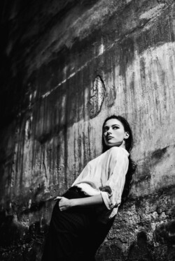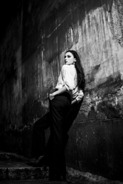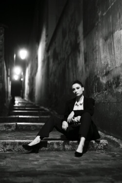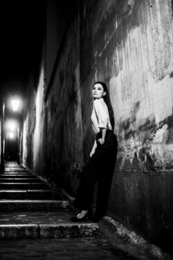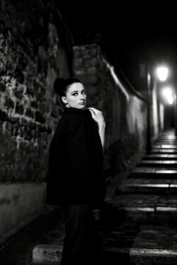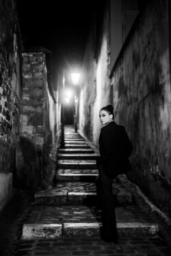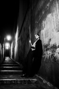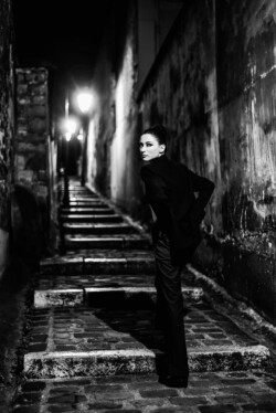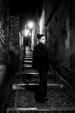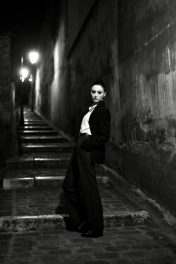 C’est en mars 2019 que j’ai découvert la célèbre photographie réalisée par Helmut Newton, en collaboration avec Yves Saint-Laurent dans la Rue Aubriot à Paris. Tombée amoureuse de cette création, elle a été le déclencheur de plusieurs de mes travaux nocturnes et de ma passion pour le noir et blanc.